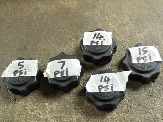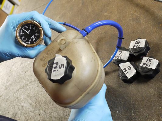 The standard cap is notorious for opening too early. In effect a cap that opens at 3 psi allows the coolant to boil as low as 105 deg C. Even with a first fan cut in temp of 105 deg C boiling over can occur. Combine this cap problem with a first stage radiator fan that’s not working at all, and boil over is guaranteed. Our simple test rig using pump, pressure gauge, tank and various cap samples shows large variations in cap opening pressures. They ‘should’ all open at 15-16psi.